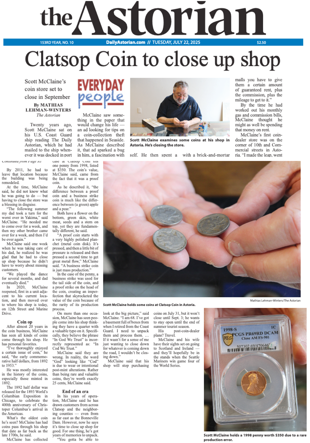 Clatsop Coin’s last day of business will be Wednesday, September 3, 2025.
